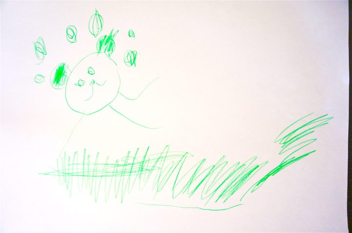 下の絵は、「河川敷でライオンの凧をあげている絵」。幼稚園で行ったお正月遊びで河川敷で凧揚げをしたことがとても印象に残っているようです。ライオンの凧ではなかったと思いますが、娘はライオンが好きなので、おそらくライオンの凧を描いたのでしょう。緑の色鉛筆が河川敷の草木を良く表現しています。(描写時4歳1ヶ月)