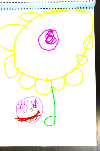 最後の絵は、「ひまわりを見ている私」。これは夢で見たことを再現したとのこと。まだひまわりが咲く時期ではないですが、図鑑で見たひまわりの印象がそのまま夢に出てきたようです。これは幼稚園の自由遊びの時間に描いています。人や動物の絵が多く、花の絵をあまり描かないので、驚きました。(描写時4歳1ヶ月)